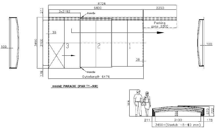 transparent kot steklo, 4 mm, kompaktni polikarbonat / antracit | PAR-T1-desna | 3.10 | 6.40 | 0.722 | 3 | EUR 5,500 | 1 bočna vrata in podaljšana vodila za 2,25m | |