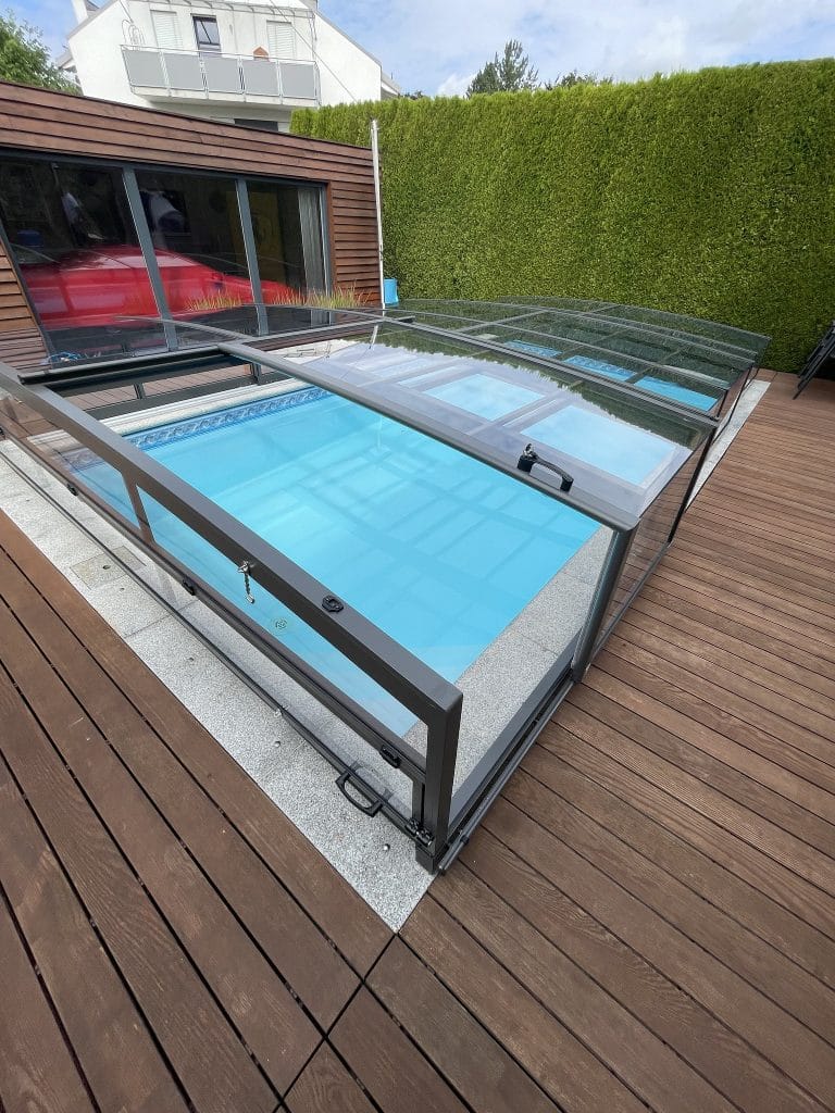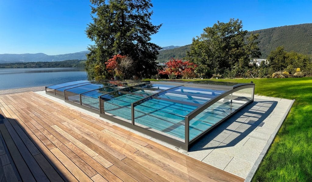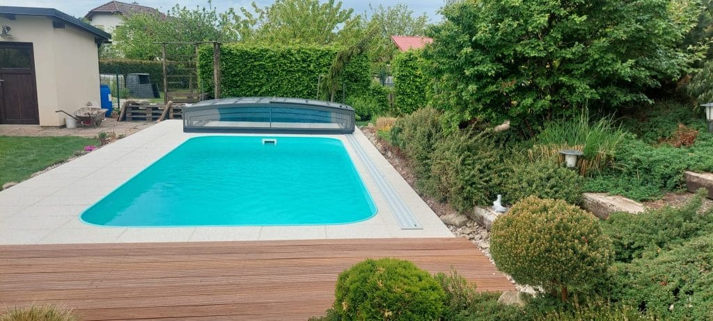 Estetika in praktičnost: Nizka izvedba s teleskopskim zapiranjem ne kvari videza vašega vrta, vodila na eni strani pa omogočajo popolnoma prosto pot ob bazenu.