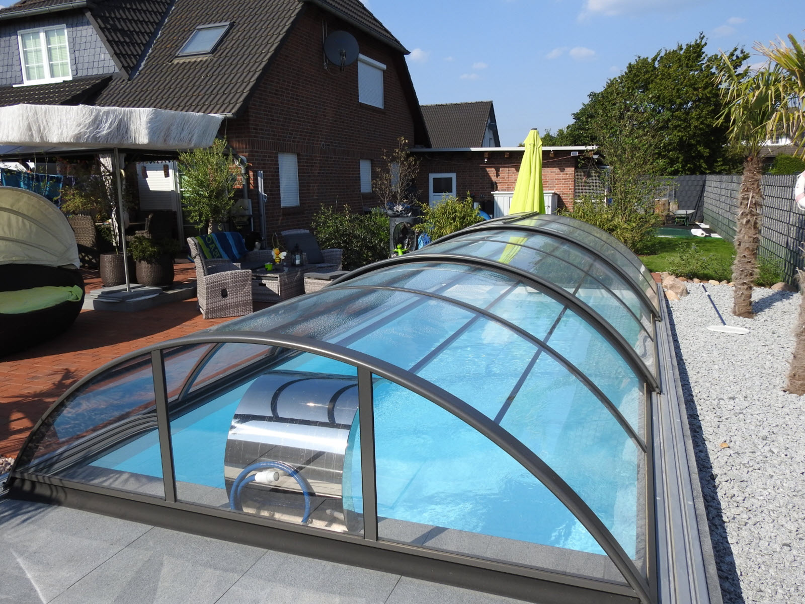 Teleskopska streha za bazen AZURE Compact navdušuje s sodobnim dizajnom in kompaktno, nizko višino, zaradi česar se popolnoma prilega vsakemu vrtu ali zunanjemu prostoru. Diskretna oblika omogoča estetsko dovršen videz, hkrati pa ohranja funkcionalnost in zaščito bazena.